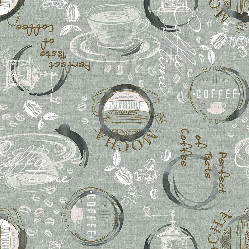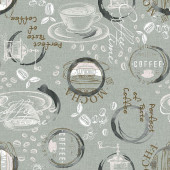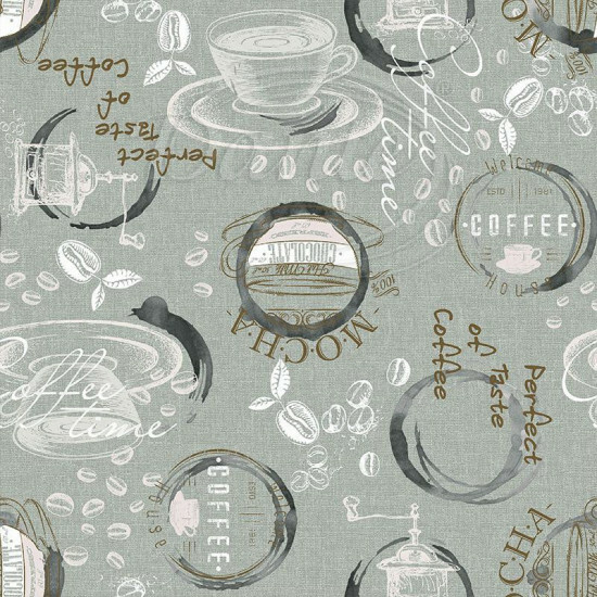 - Základ doplňuje dekorativní potisk s kruhovými motivy, kávovými prvky a jemnými nápisy, který dodává látce moderní a lehce vintage charakter.