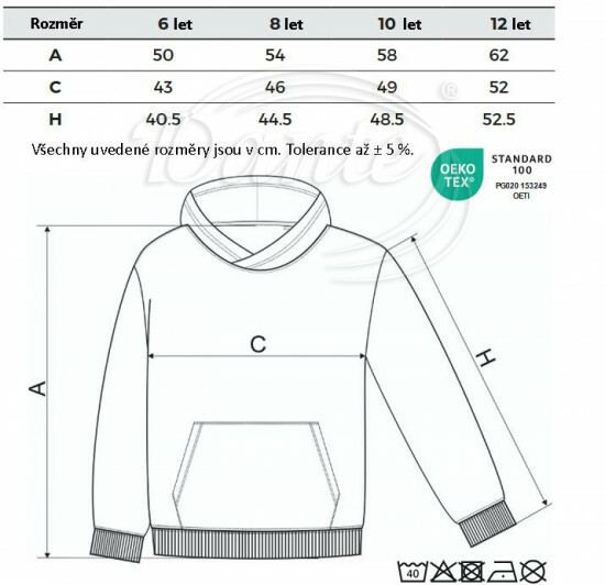 Výplňková pletenina, vnitřní strana počesaná, 60 % bavlna, 40 % polyester (složení se může lišit u některých barev - 75 % bavlna, 25 % polyester). Volný střih s bočními švy, kapuce s podšívkou. Nízkohlavicové rukávy