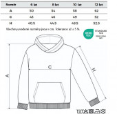 Výplňková pletenina, vnitřní strana počesaná, 60 % bavlna, 40 % polyester (složení se může lišit u některých barev - 75 % bavlna, 25 % polyester). Volný střih s bočními švy, kapuce s podšívkou. Nízkohlavicové rukávy
