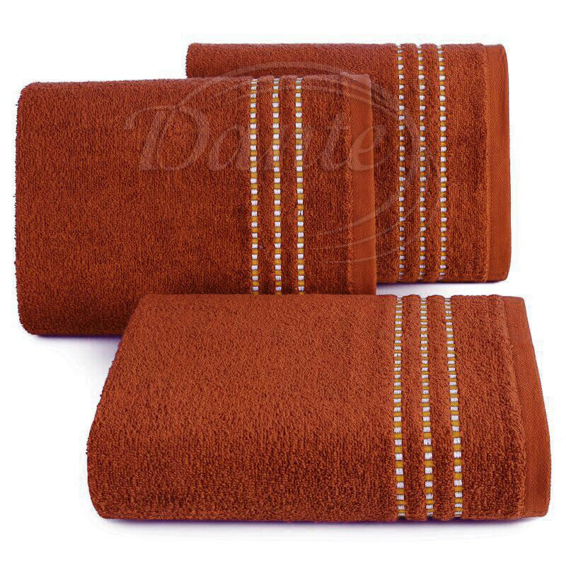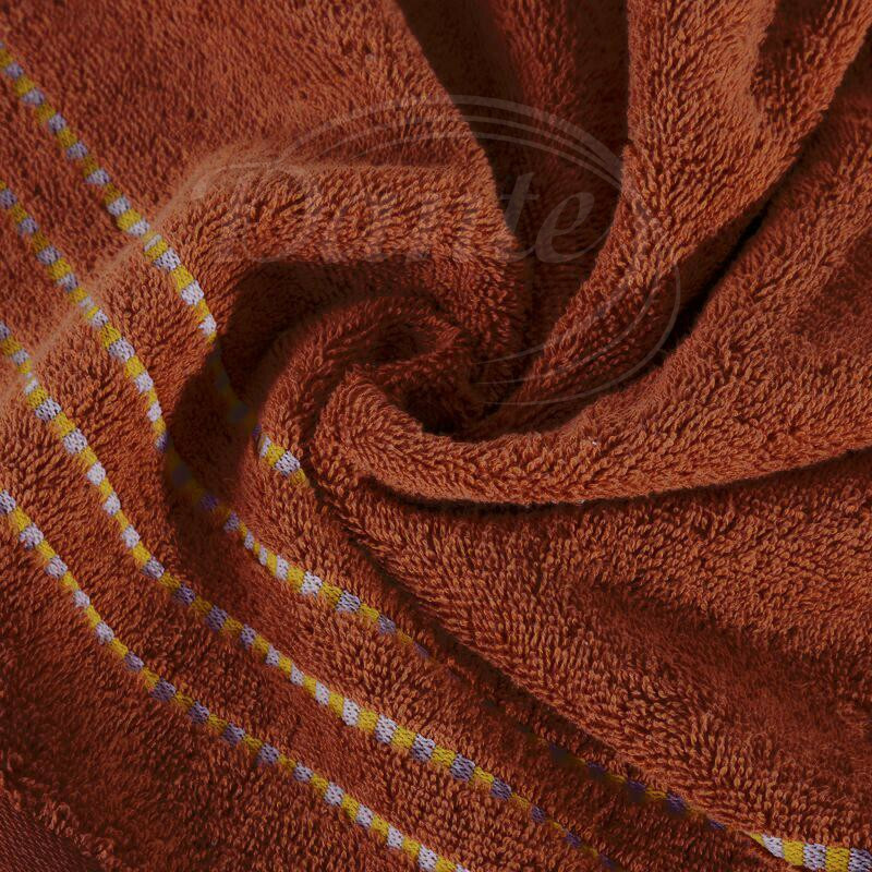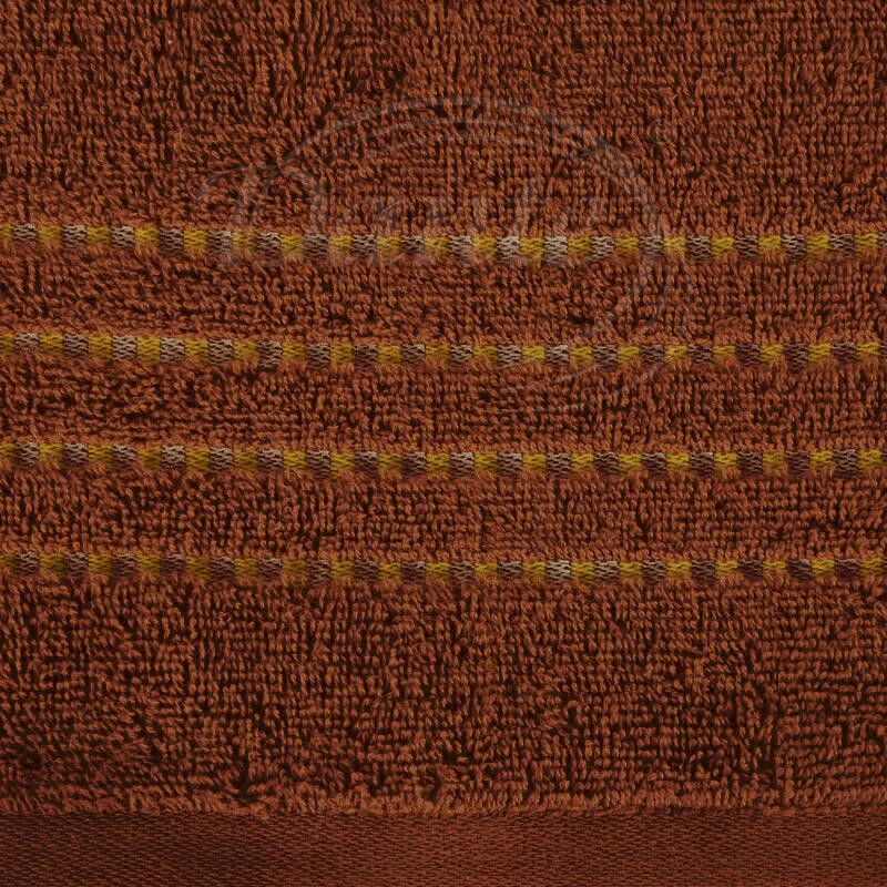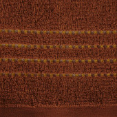 - Osušky a ručníky s výjimečnou měkkostí a savostí v měděném odstínu zdobené ve spodní části proužky šedožluté barvy.