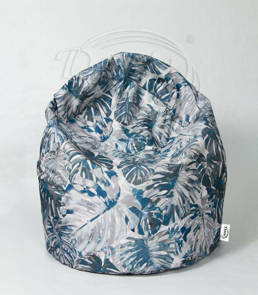 - Sedací vak se vzorem velkých listů v kombinaci béžových a petrolejově modrých tonů.