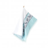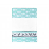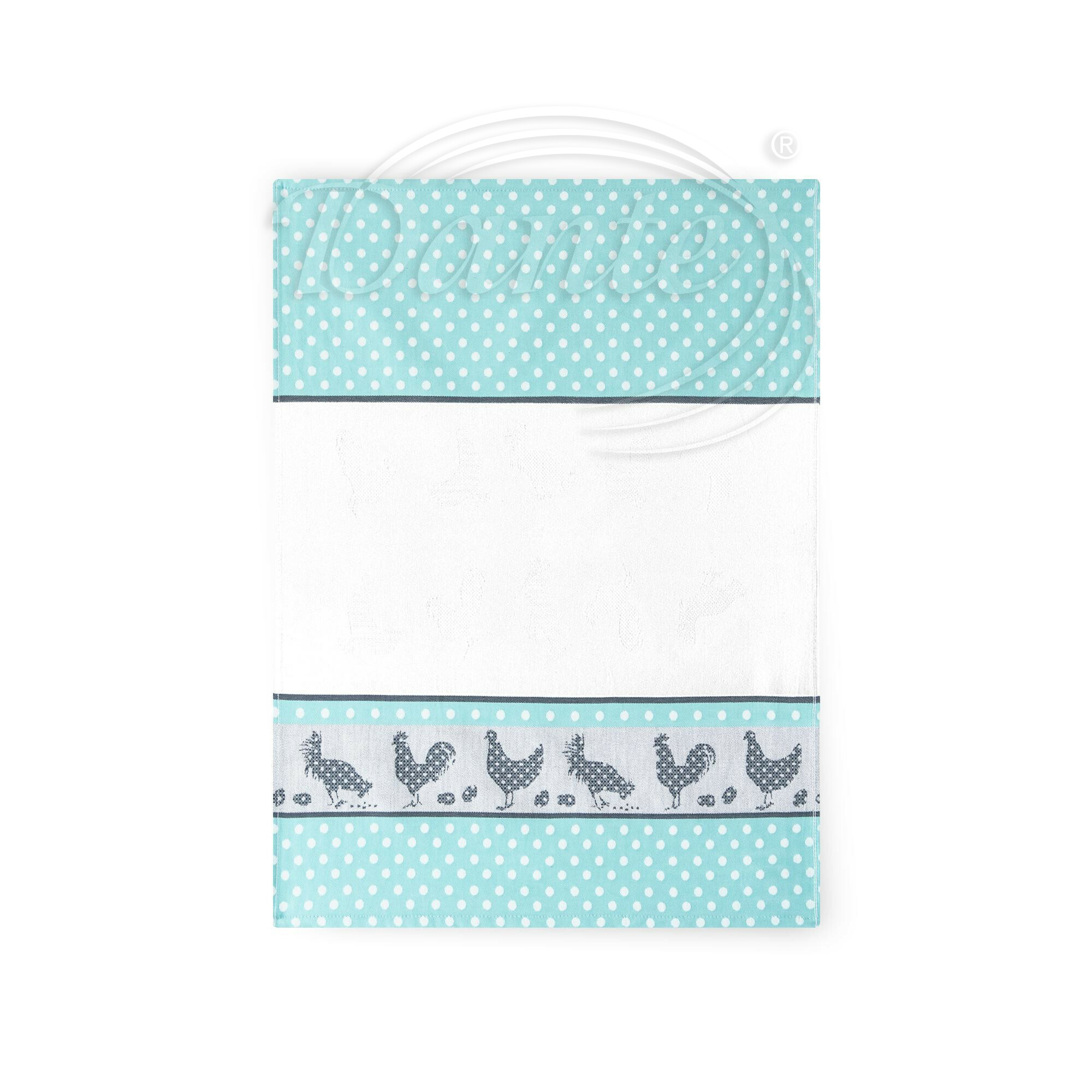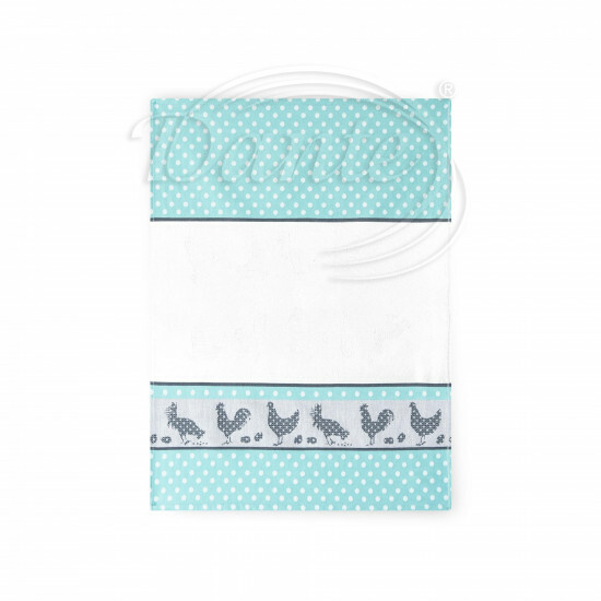 - Horní a spodní okraj lemuje tyrkysová bordura s bílými puntíky. Nad spodním okrajem je navíc šedomodrý pruh s kohouty a slepicemi.