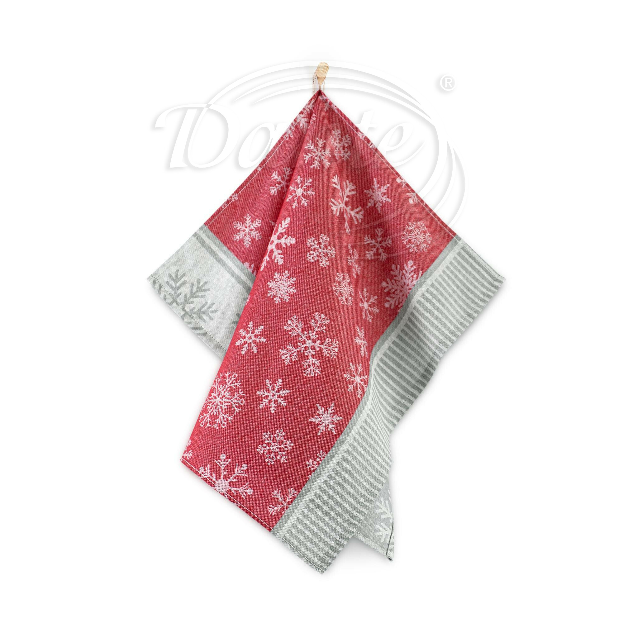 - Dominantní část utěrky je červená s bílými sněhovými vločkami. Po stranách utěrky je lemování ve světle šedé barvě, na jedné straně zdobené vločkami a na druhé jemnými pruhy.